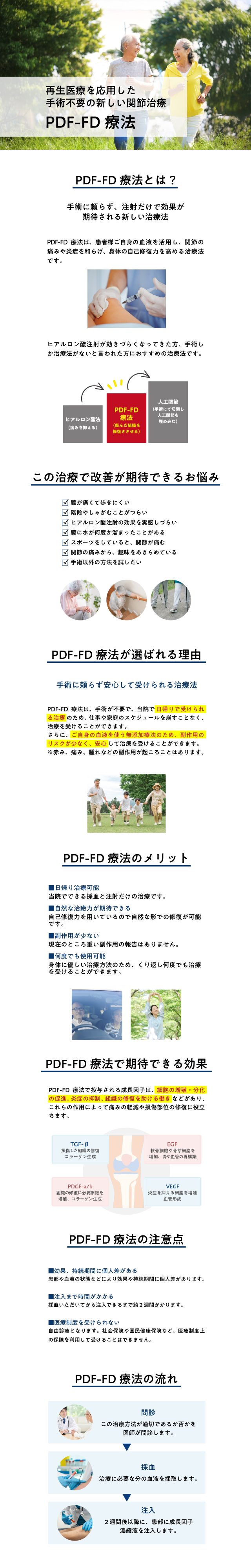 PDF-FD療法とは、Plams Derived Factor-Freezedry(血漿由来因子)療法の略称です。患者様ご自身の血液に含まれる血漿から成長因子を抽出し、濃度を高めて患部に注入することで、損傷がある部位の修復や痛みの抑制・軽減等の作用が期待できます。