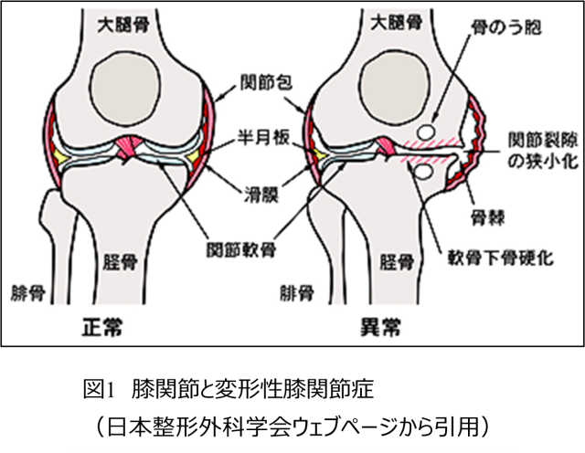 変形性膝関節症は、長年の膝への負荷により、膝の関節軟骨がすり減って炎症が起こり、関節が変形する病気です(図1)。超高齢化社会をむかえた日本では、患者数2500万人と推定されています。関節軟骨は細胞密度が低く、再生しにくい組織です。