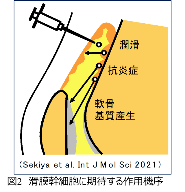 - 滑膜幹細胞は、関節腔内で潤滑効果や、炎症の抑制効果、軟骨の基質を増加する効果にかかわる栄養因子を作り出します。