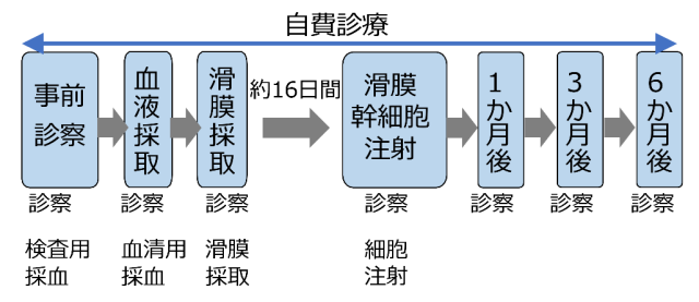 - 治療に伴う診察、採血検査、自己血清のための採血、滑膜採取、滑膜幹細胞注射、注射後1か月、3か月、6か月時の診察費用が含まれています。